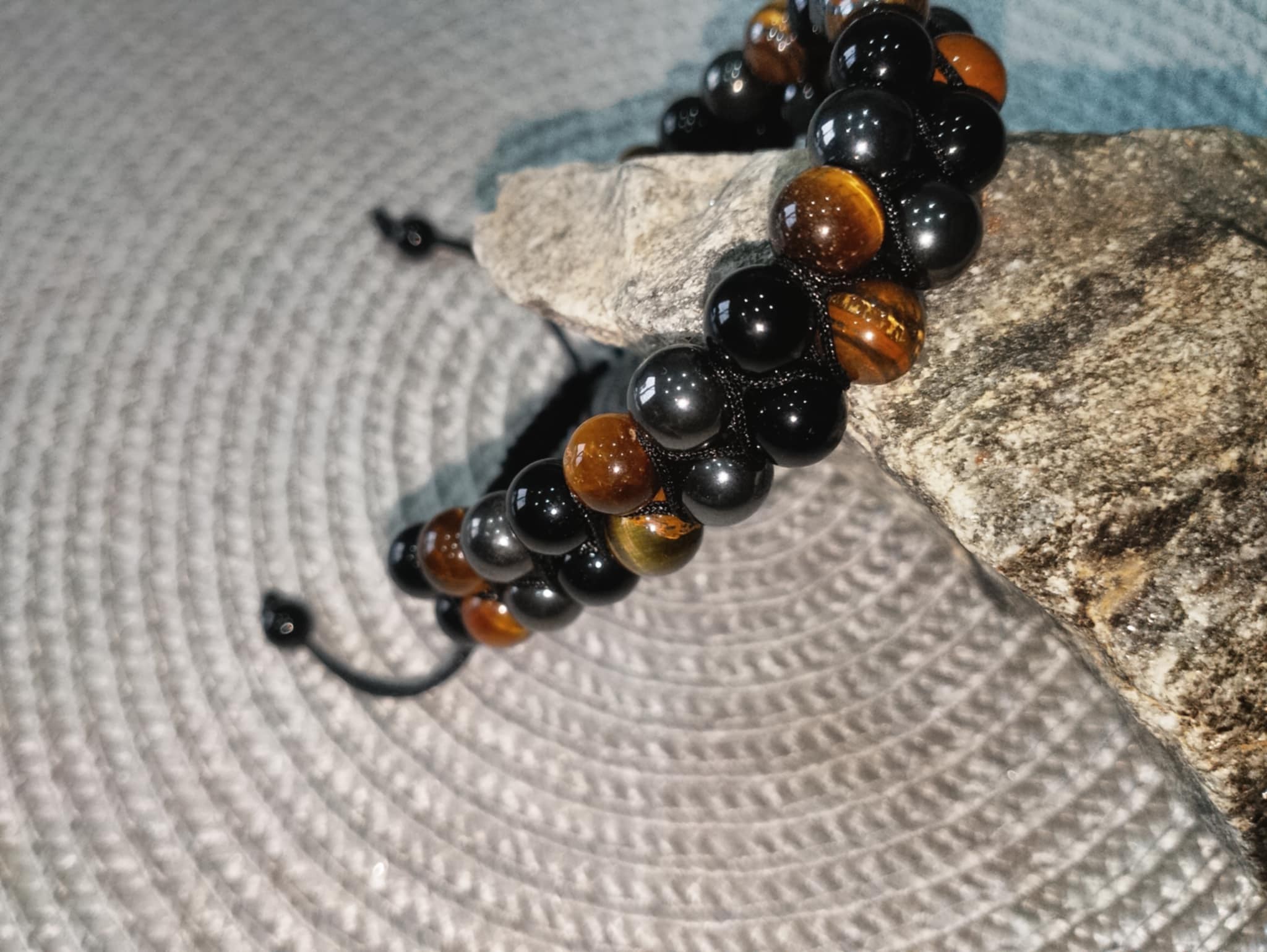 Bracelet Tressé Ajustable "Triple Protections" en Hématite, Oeil de Tigre & Obsidienne
